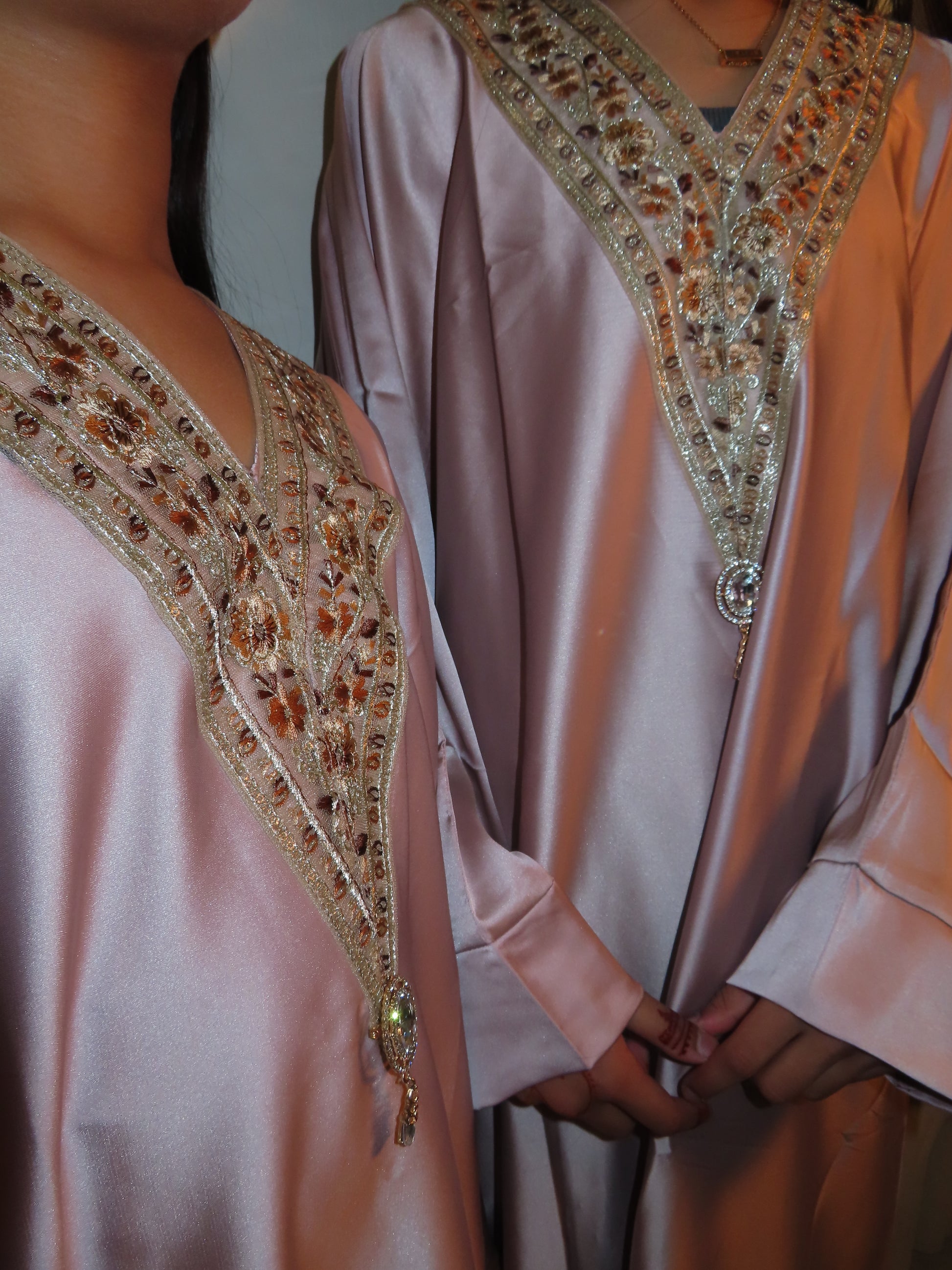 Made from luxurious silk, it features a beautifully detailed lace V-neckline, adding a touch of elegance. Available in a stunning pink/rose gold shade, this kaftan is both stylish and comfortable.