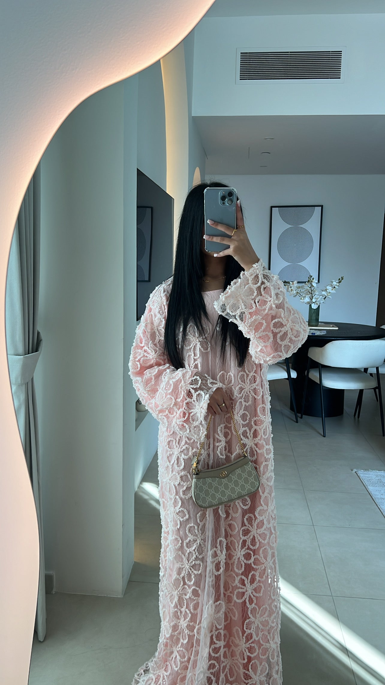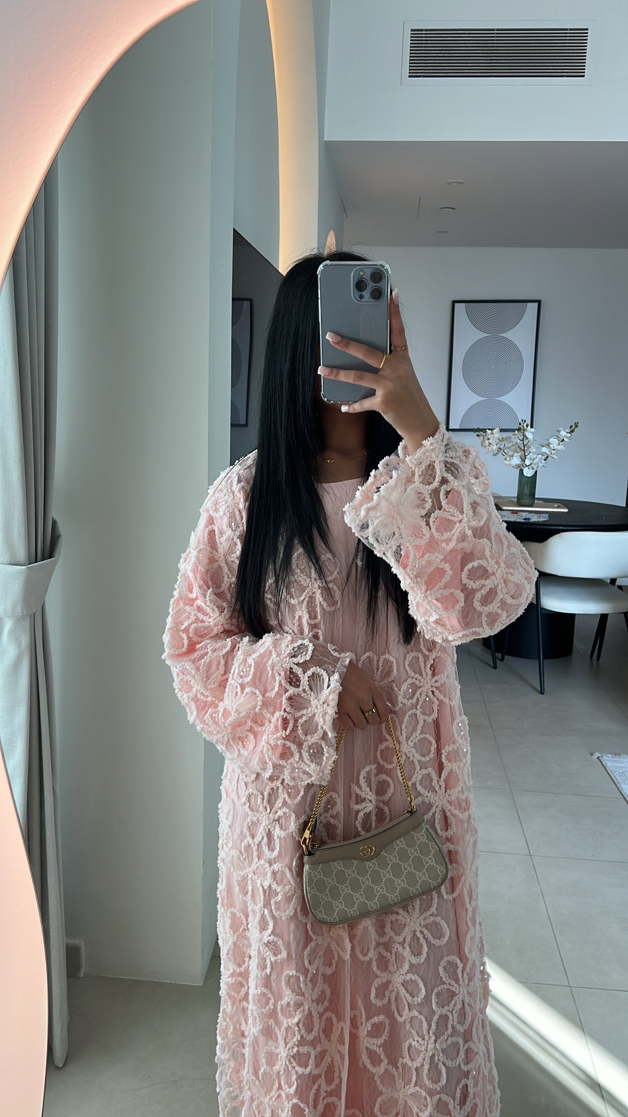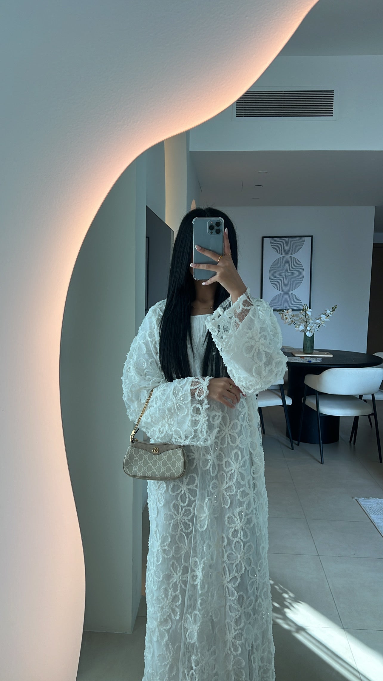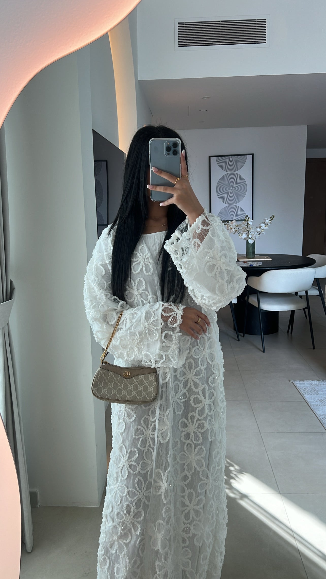 Our Petal Collection is curated from a light lace fabric with beautiful fluffy flower detailing and a hint of sequins for just the right touch of sparkle. Perfect for summer days and elegant evenings, each abaya comes with a matching inner slip and hijab for effortless, graceful styling.