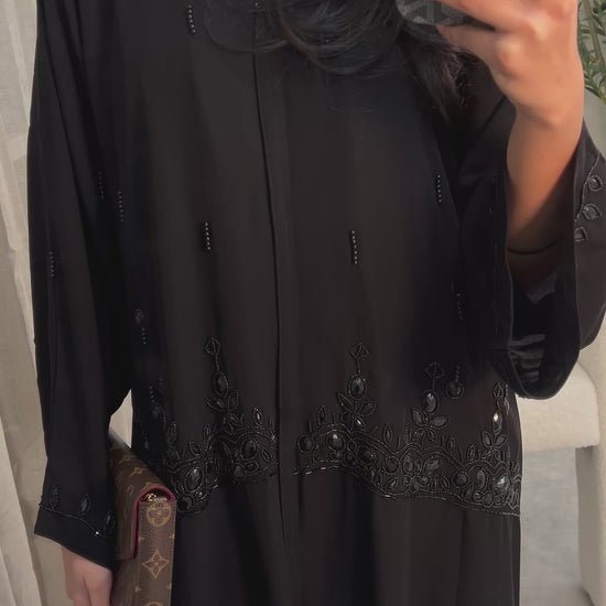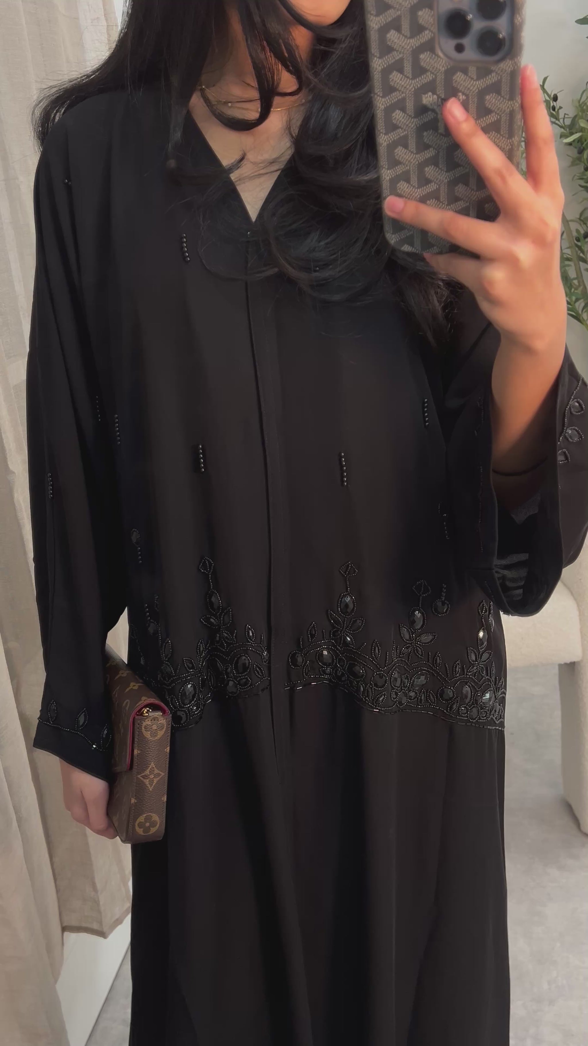 The Loujain Abaya is a stunning embodiment of sophistication, crafted from luxurious Nida fabric in classic black. Adorned with elegant black gemstones, it features button closures for versatility and comes complete with a matching black chiffon hijab for a refined, polished look.