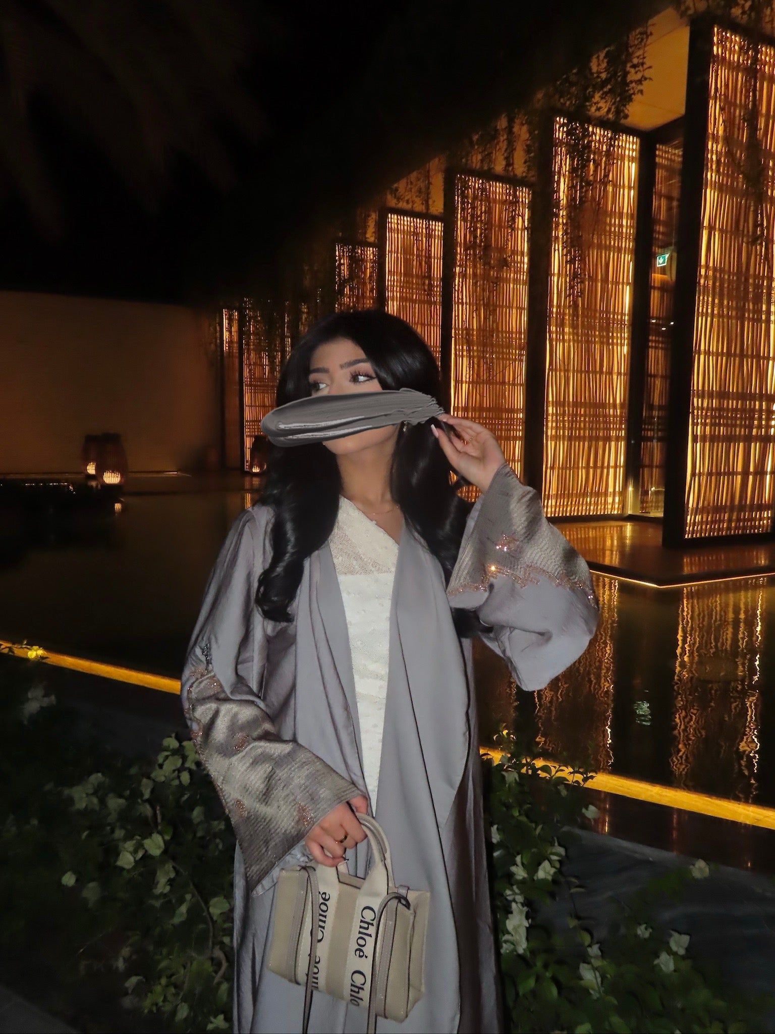The Diana Abaya is elegantly crafted from crushed silk, a soft matte-like fabric that exudes sophistication. Featuring intricately embroidered sleeves adorned with delicate beadwork, this unique design showcases a graceful waterfall cut. Complete with a matching inner slip and hijab, it offers both elegance and refinement.