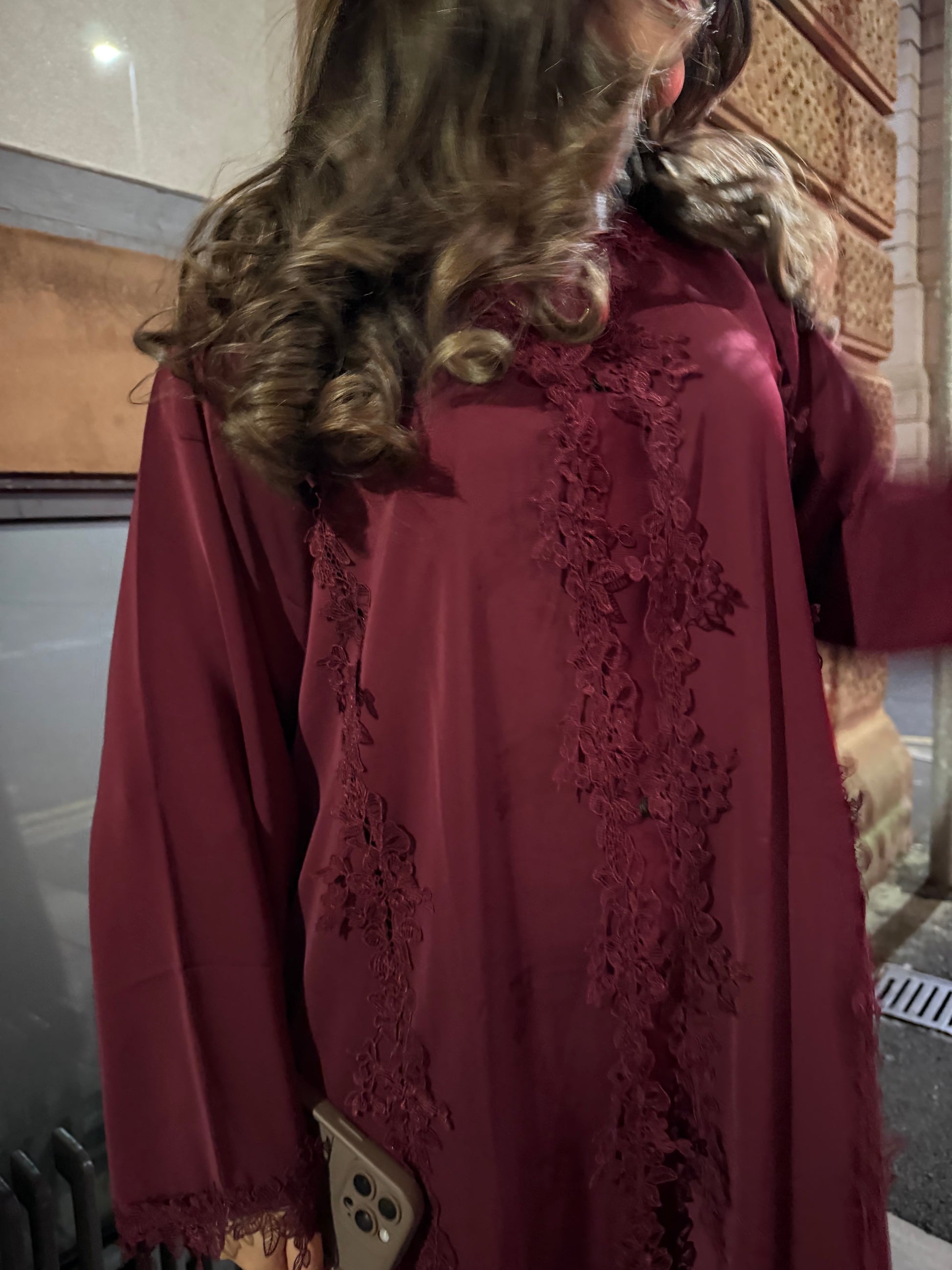 Indulge in timeless elegance with our Luxury Lace Abaya Set, meticulously crafted from premium Nida fabric for a soft, flowing drape. This there-piece ensemble includes an inner slip, matching hijab, offering a complete, graceful look. Delicate lace detailing cascades along the front and sleeves, blending classic sophistication with modern refinement — perfect for both everyday wear and special occasions.